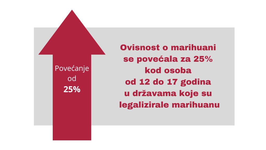 Prema izvještaju, u „legalnim“ državama od primjene legalizacije zabilježen je porast poremećaja uzrokovanih upotrebom kanabisa (eng.Cannabis Use Disorder – CUD) za 25% među osobama od 12 do 17 godina.